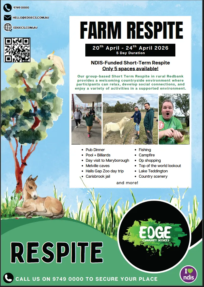 Join our group-based Short Term Respite in rural Redbank, providing a welcoming countryside environment where participants can relax, develop social connections, and enjoy a variety of activities in a supported environment.